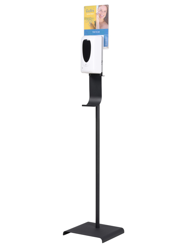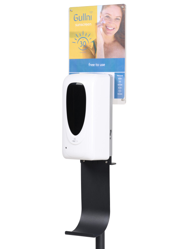 Os dispensadores de protetor solar da Gullni funcionam sem contato e com pilhas. Isso os torna higiênicos no uso e fáceis de posicionar em qualquer local. A combinação de uma base de aço com um poste de alumínio garante uma estrutura extremamente estável.